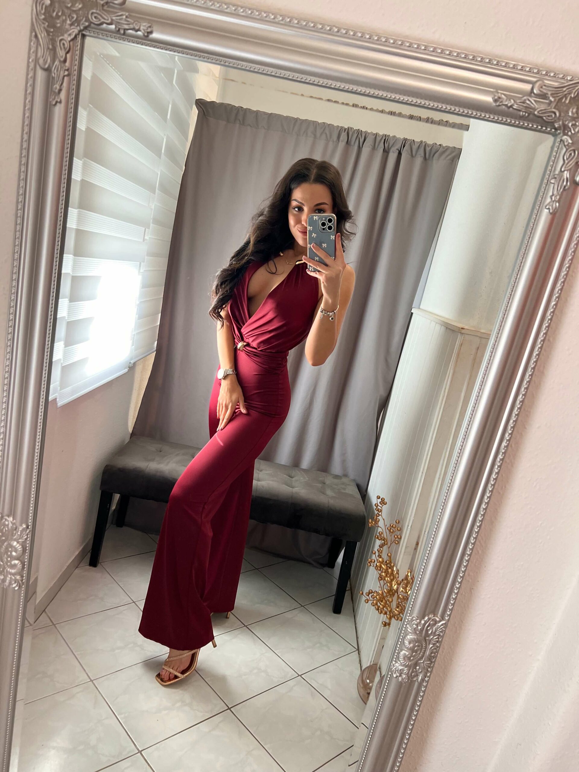 Milen nyakba akasztós , arany diszitéses nyitott burgundi overál.