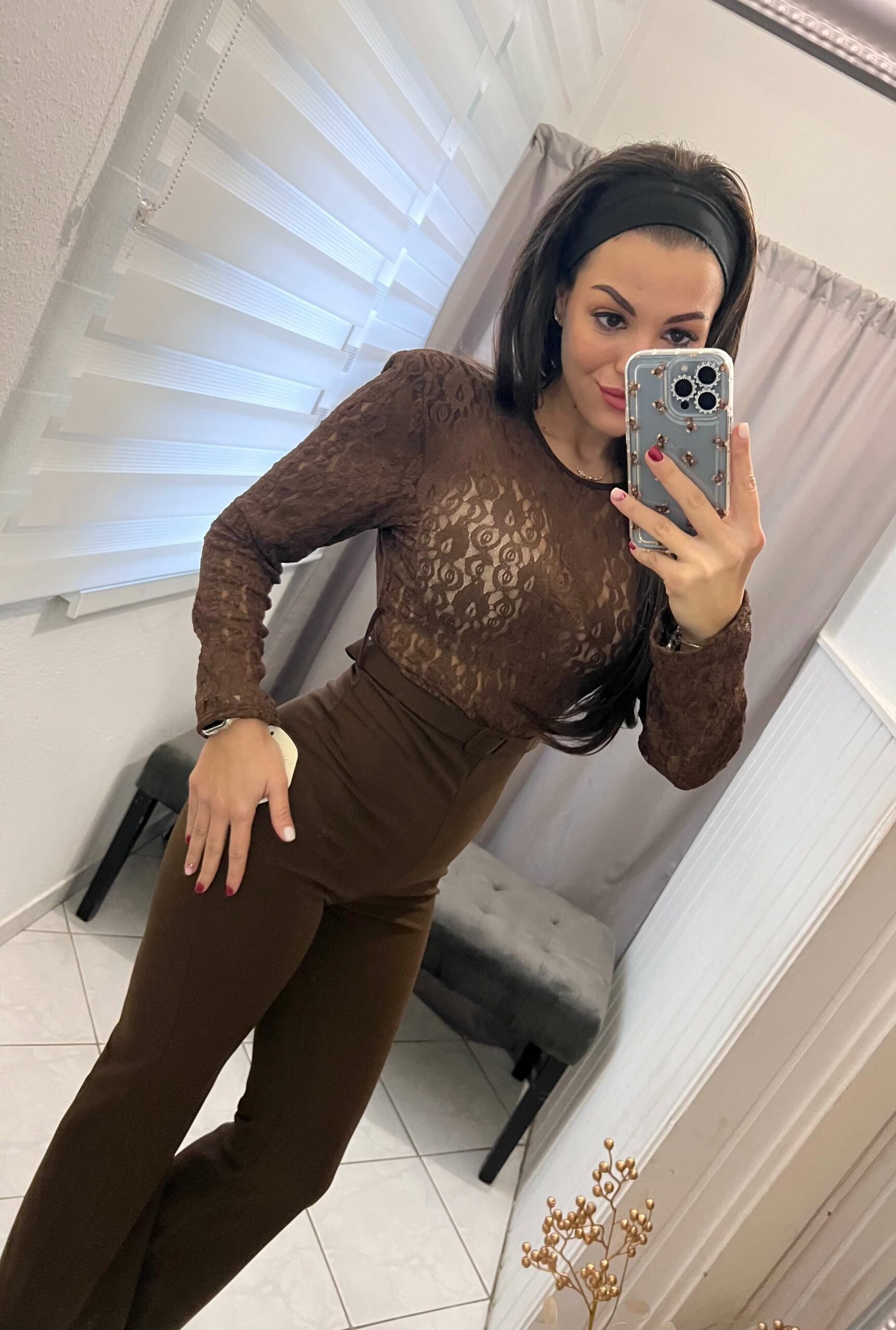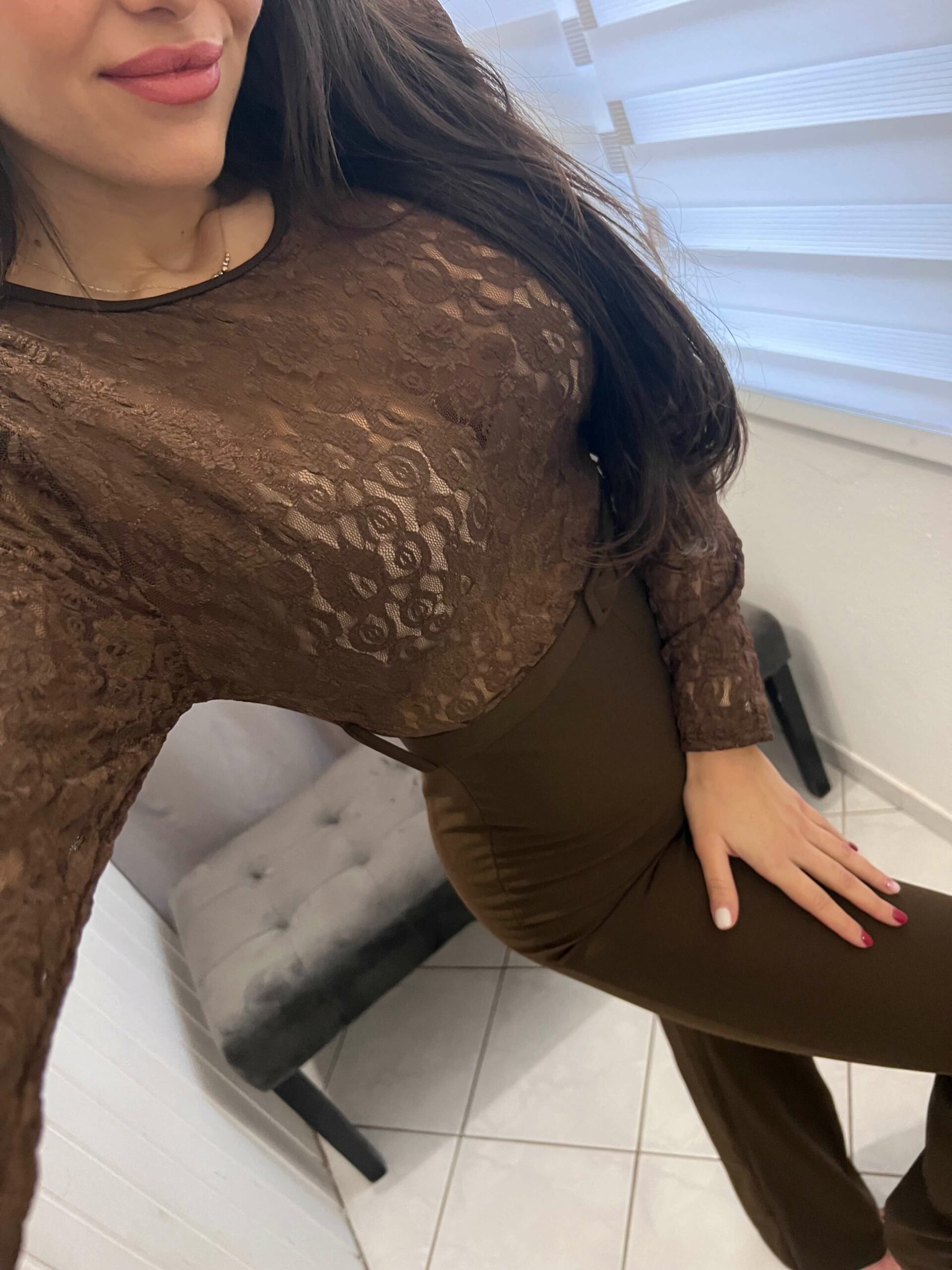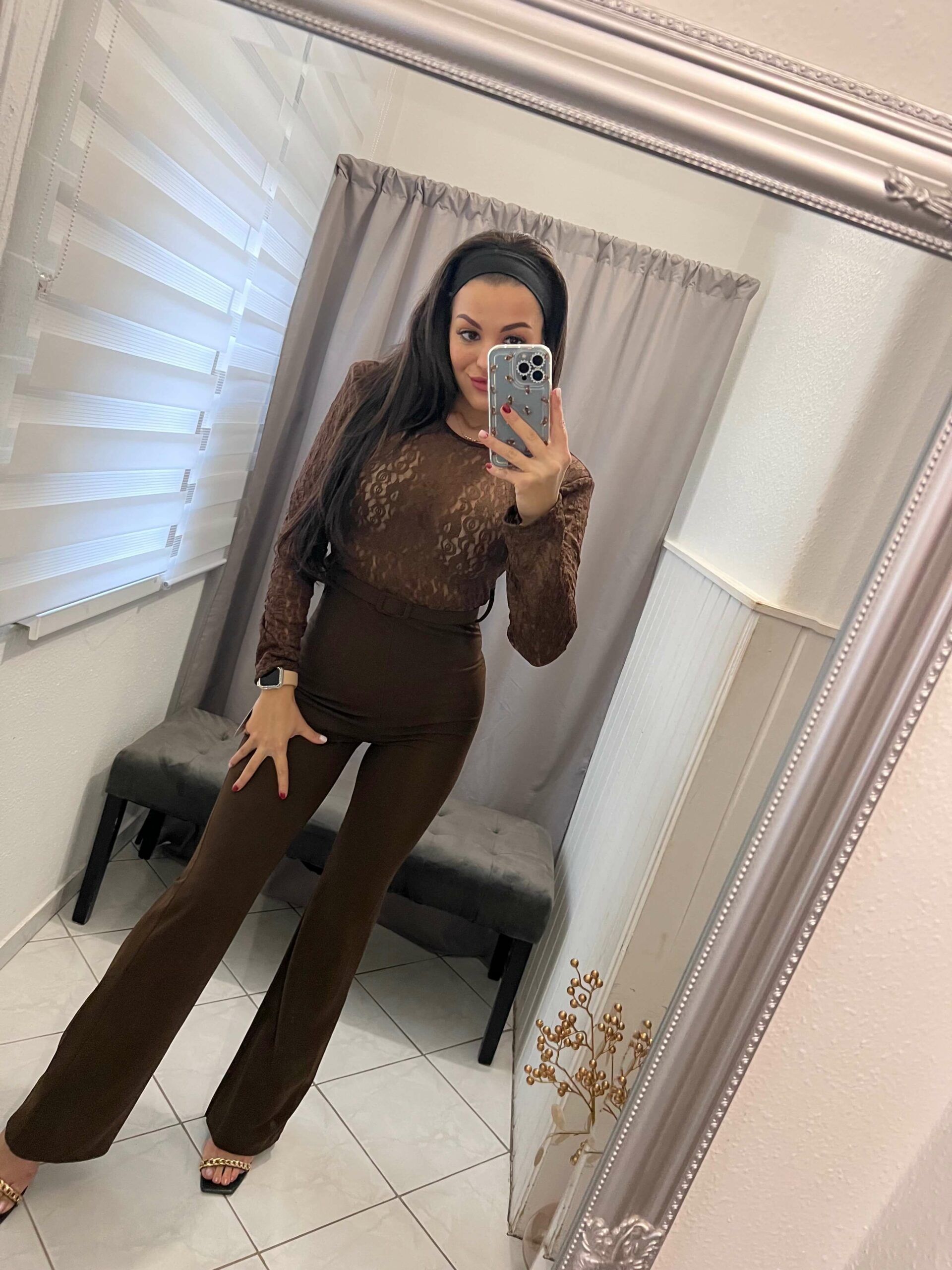 Szelena csokibarna felsőrészén csipkés overál, hozzá tartozó övvel.