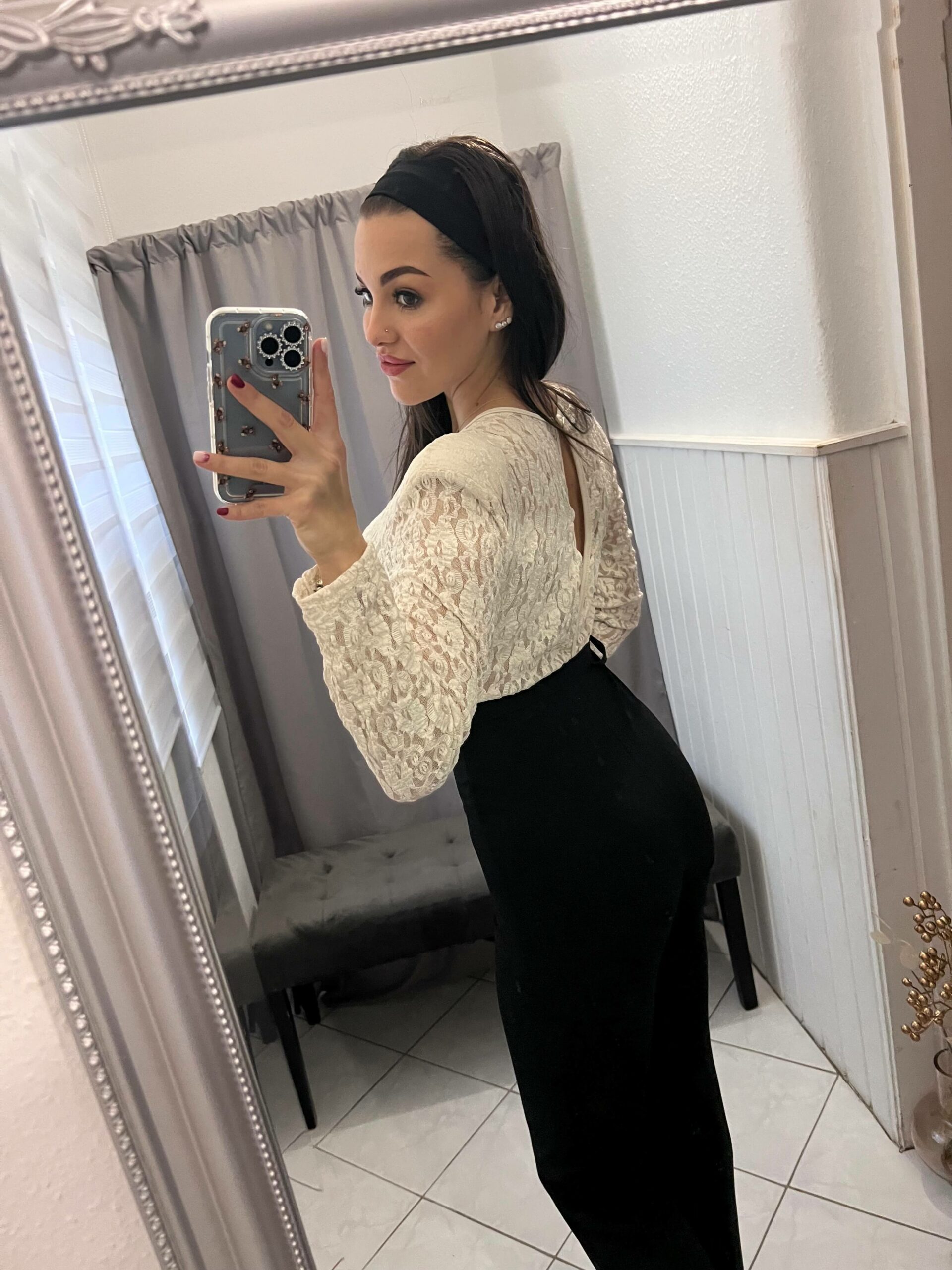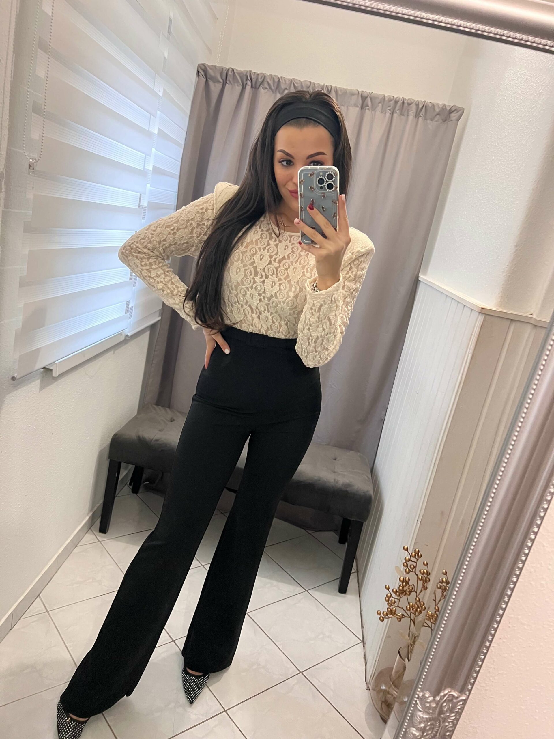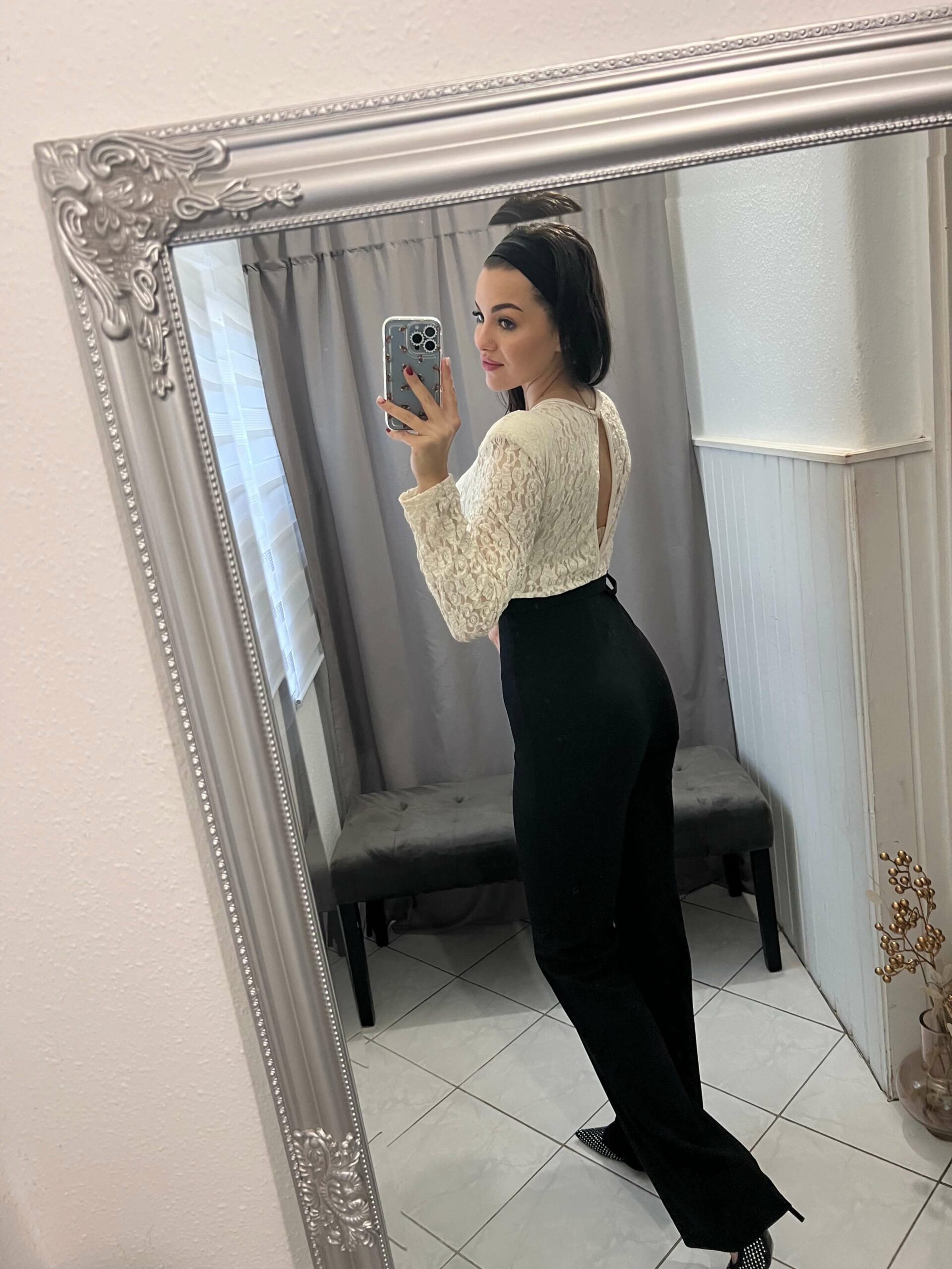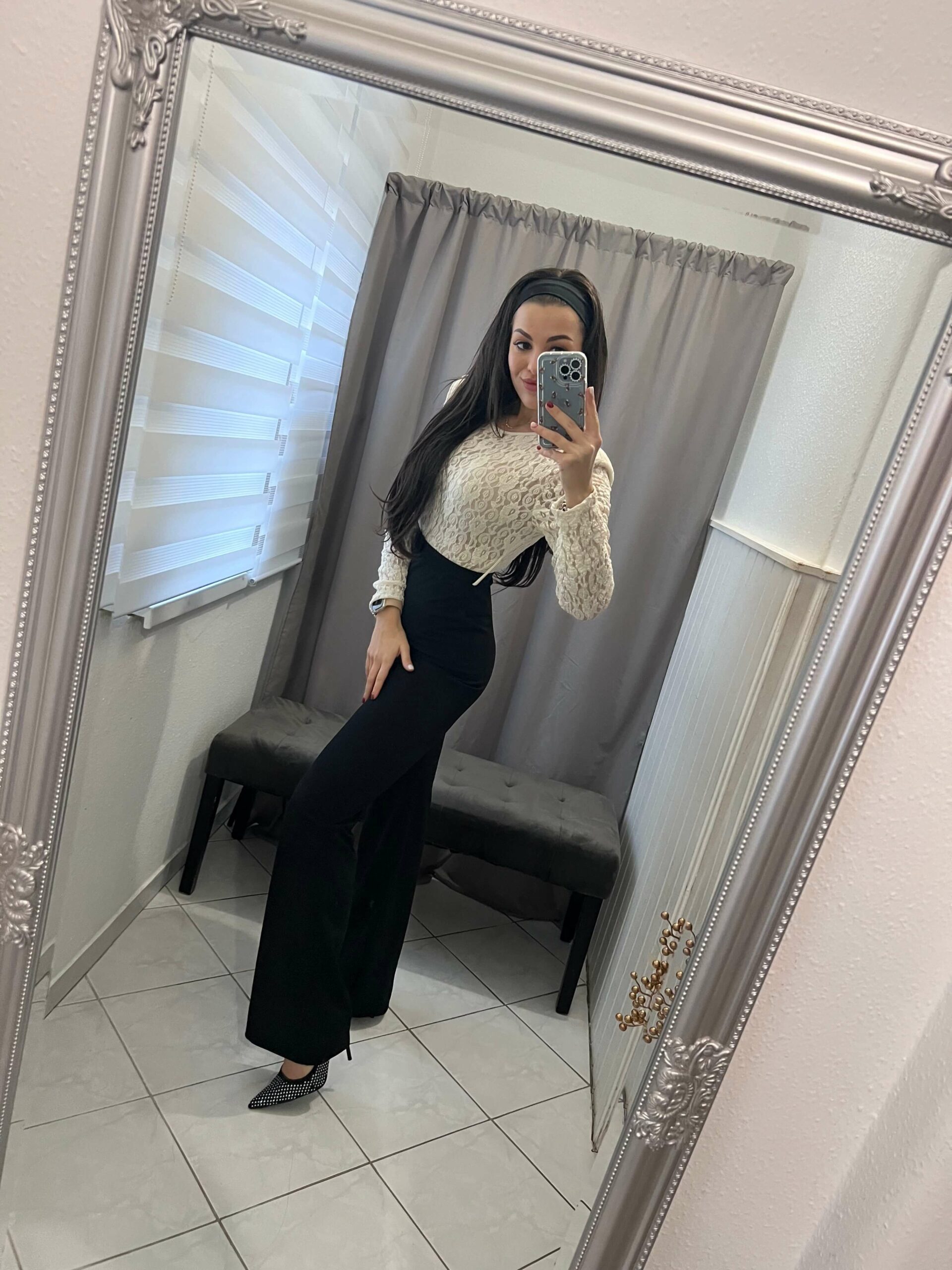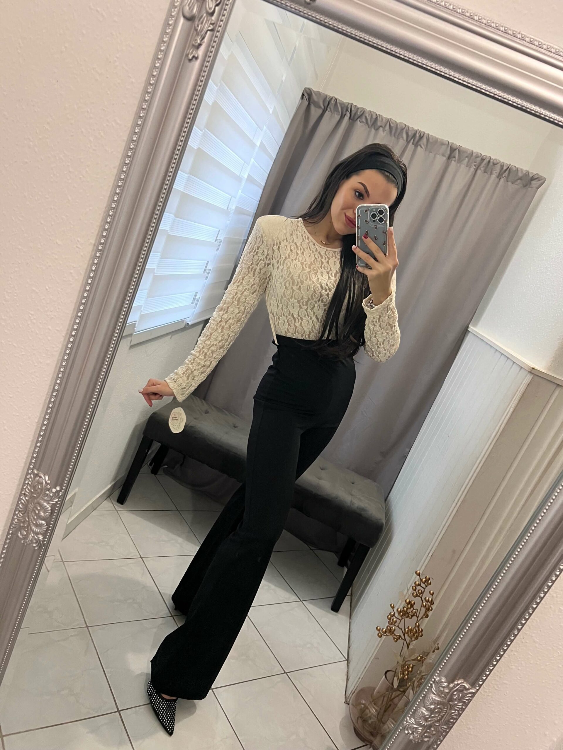 Szelena fekete felsőrészén bézs csipkés overál, hozzá tartozó övvel.